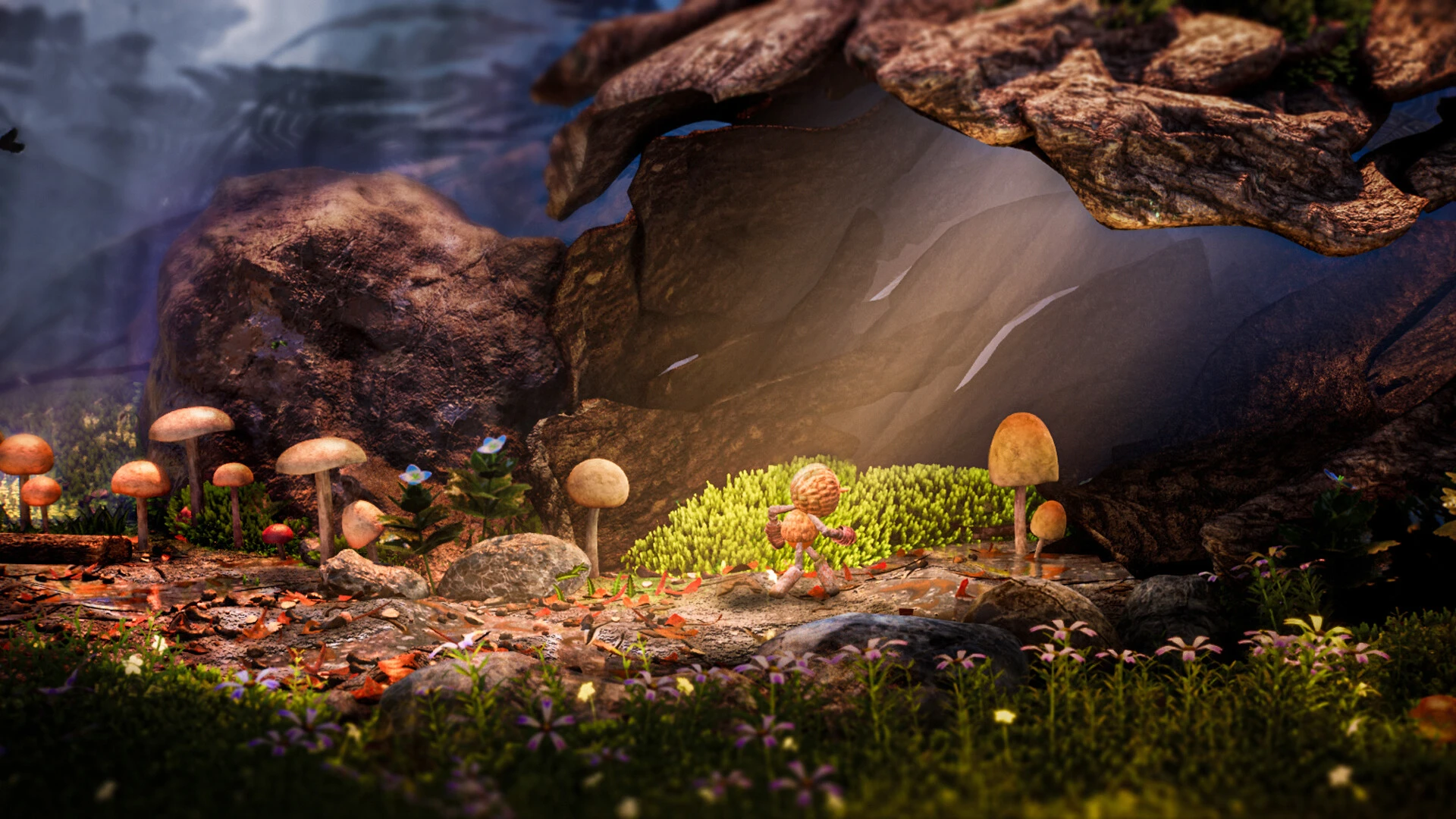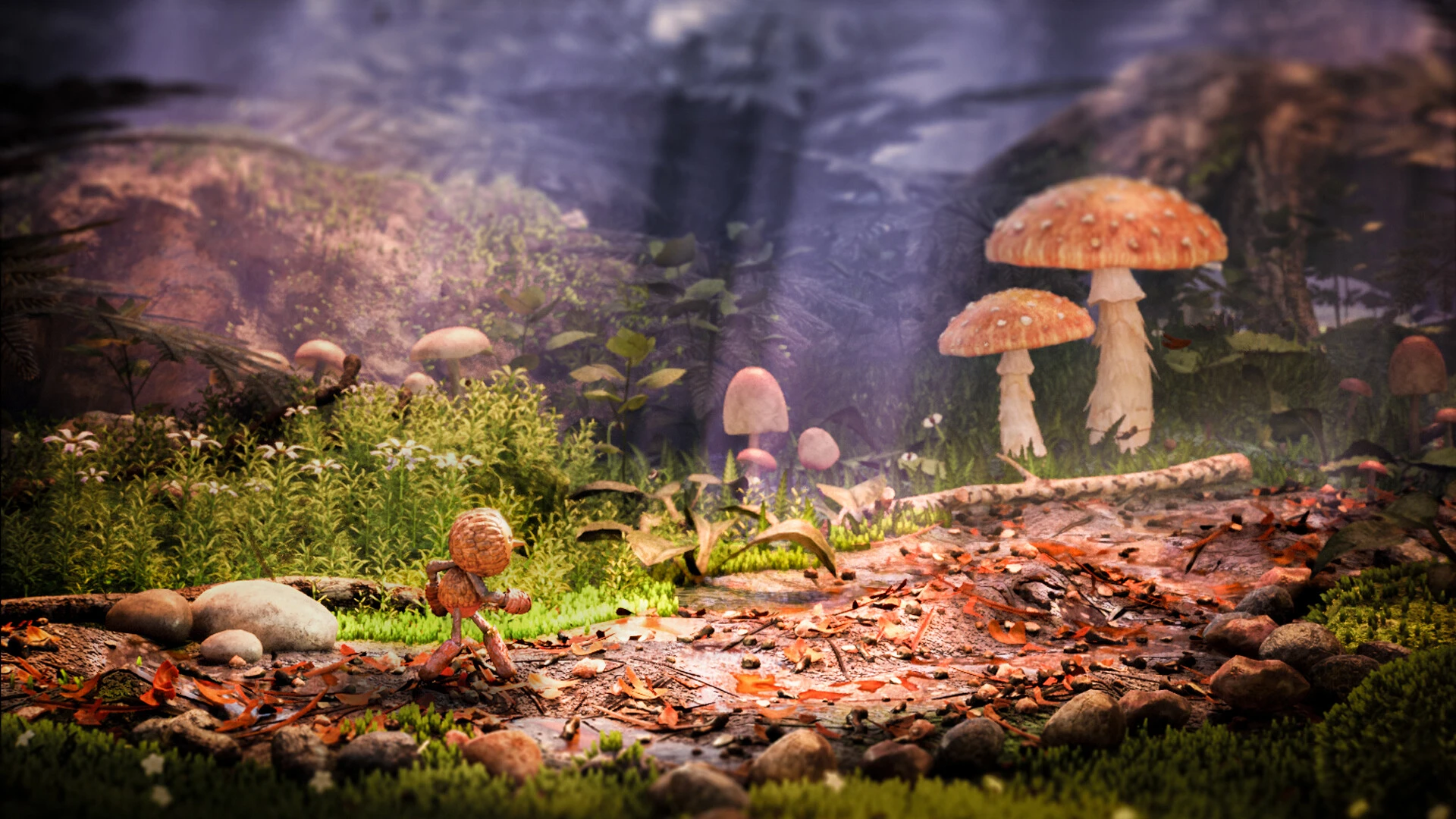 The complexity of the environment lies in the macroscopic scale. Mushrooms had to be gigantic in size so that the scale matches our small characters. We also had to adapt our vegetation to convey the macroscopic aspect. As a result, our characters don't walk on grass but on moss! To have a scale reference, we created flowers or blades of grass that are larger than the moss strands.